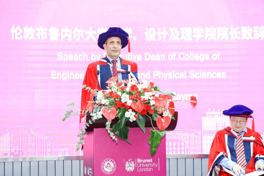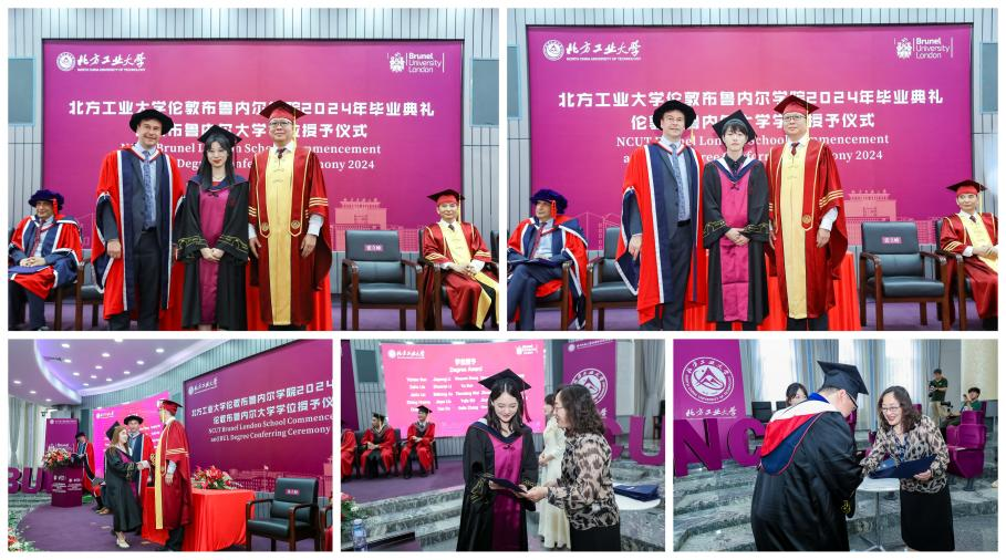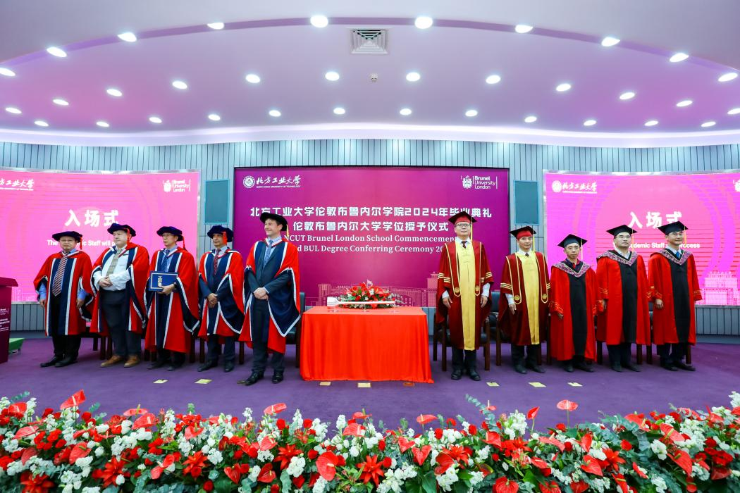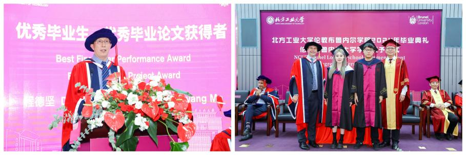 Maozhen Li主持学位授予仪式。102名毕业生依序上台,与两董事长合影留念,现场领取伦敦布鲁内尔大学的学位证书。