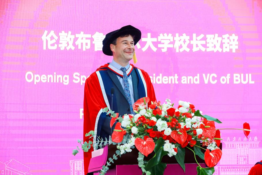 Andrew Jones董事长宣布典礼开始。他对两校联合培养的首届毕业生表示热烈祝贺,高度赞扬了毕业生所取得的发展成就,鼓励他们成为全球新时代的开拓者和推动者。他强调了两校合作的深远意义,对大家的未来充满无限期待与美好祝福。