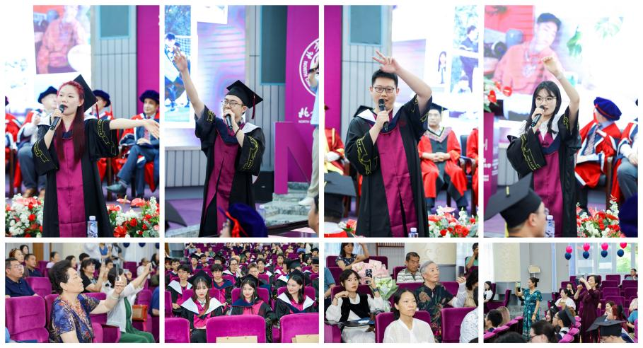毕业生代表领唱了歌曲《一路生花》,大屏幕上闪回的一幕幕在校学习生活场景,唤起了大家的美好记忆,引发了强烈共鸣。